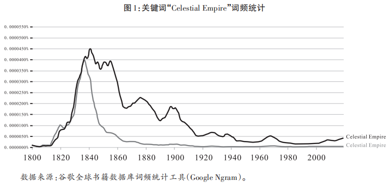 《圣彼得堡新闻报》作为彼得一世1703年下令创办的俄国第一份印刷报纸以及1756年前俄国唯一的报纸,影响力不言而喻,是俄国皇帝、贵族等了解国内外社会政治的重要信息来源。根据这则未署名的短文推断,“天上帝国”这一称谓于19世纪30年代初已在俄国上层社会流传,但俄国人尚不解其意。从引文对其中文出处的好奇来看,当时俄国人恐怕不记得曾经听到清朝官员或民众提过“天上帝国”,因而很可能是先从西欧人那里听说了此事。“Celestial Empire”(即俄国官方报纸上“天上帝国”的英文对应词)是在18世纪末、19世纪初作为中国的代称出现在英文书刊的。它的使用频次自1815年激增,1840年达到顶峰后逐年下降,1930年后活跃度长期趋于零(见图1)。欧洲社会起初对“天上帝国”的历史渊源也不甚了解,但已觉察到其中包含的妄自尊大。1822年在伦敦发行的杂志《闲娱阅评:文学生活轶事精选》中有一篇题为《天上帝国》的文章写道: