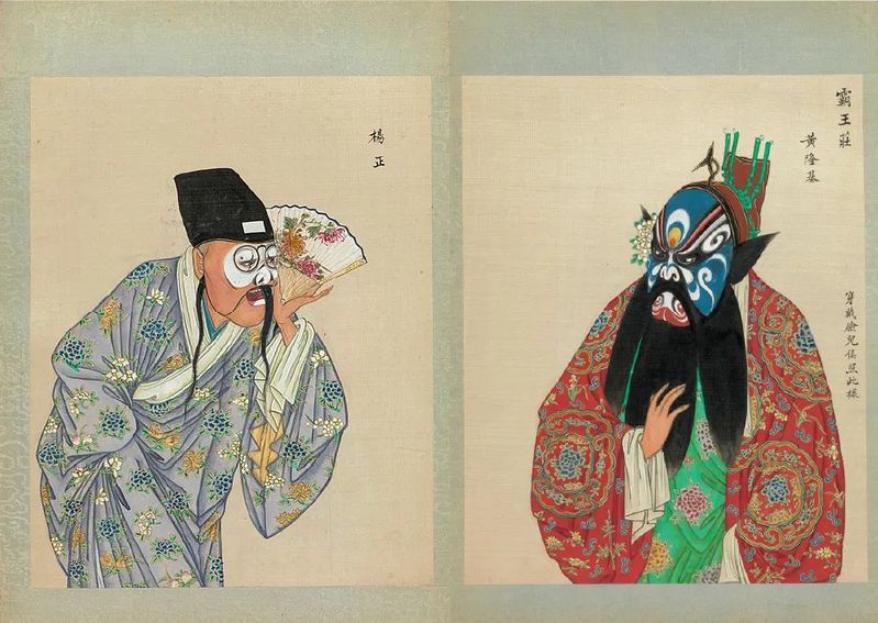 清末年间,清朝昇平署(专职管理宫廷戏曲演出的部门)曾出版一系列工笔绢画,为接近一百位京剧角色留下肖像,详细纪录了他们的戏服及妆容。