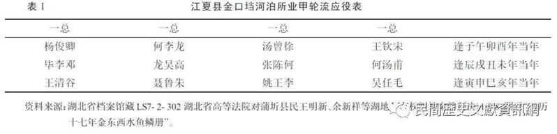 在两湖地区的实际编排中,里甲系统中每甲的户数会多少不一,但每里十甲的结构却是得到了严格的执行。而在业甲系统的实际编排中,黄冈县零残湖河泊所编有六甲,每甲大约十数户不等,江夏县金口垱河泊所编制十八甲,每甲二至十四户不等。另外,据黄冈《刘氏宗谱》中作于道光十六年(1836)的“业甲序”记载:“业甲者,业渔以供国赋也。甲有八,我居其一,八家同业,是业私以营生,公以裕国。”可见,黄冈刘氏所在的河泊所业甲编有八户。这些记载表明,里甲与业甲两套系统中每甲下的户数不见得相同,而且,各个河泊所业甲数同样也不固定,这应当是受到各河泊所管辖水域面积的大小、产鱼量的多少,以及办纳鱼课之数额等具体情况的影响所进行的灵活处置。