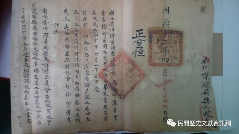 湖北黄州府黄冈县正堂恒为钤印备查事。查档册前因兵燹焚毁无存,第取业总存留收执,乾隆四十年六月二十九日,蒙前县顾印发查勘,照造零残湖坐落土名四至,及子池名目,承完湖课银两,详细清册,饬承照抄成本,逐加核对,并无错讹,合行钤印备查。