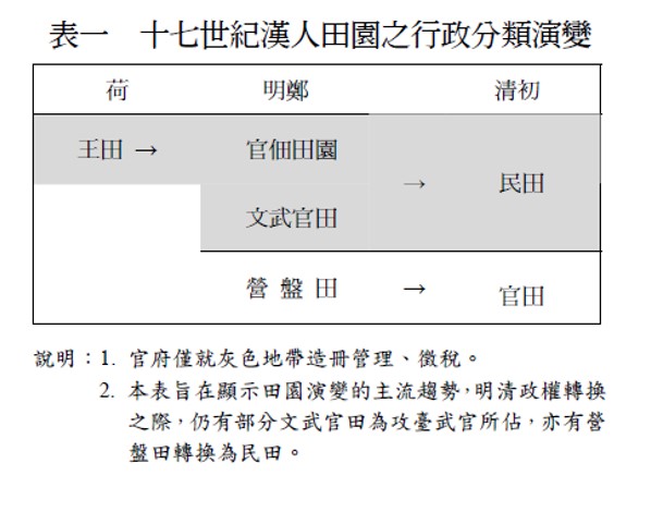 臺灣的田園在明鄭到清的政權轉換之際,曾歷經劇烈的變化。這些變化過程深刻影響了日後清朝官府對於臺灣田園的管理,以及地方社會的發展。首先,攻臺武官將領面對敗降的鄭氏政權,利用攻臺威權,趁清廷內部棄留爭議僵持不下之際,大幅圈佔明鄭時期由各地駐軍屯墾、未登記在官府稅收冊上的「營盤田」,以及由明鄭文武要員、有力之家墾殖的「文武官田」。雖然清初文獻將攻臺武官圈佔的田園稱為「官田」,實際上因為地方官員無法向「官田」的土地與農民徵得田賦和徭役,所以「官田」就不是「官有田園」或「國有地」的意思,而是比較接近於私墾田園,不在官府的土地登記之列。可以明顯預期的後果是,「官田」規模的擴大加深了臺灣地方官員徵收田賦以及維護治安的壓力。第二,明鄭時代作為「文武官田」與「官佃田園」的佃戶,因為明鄭時期作為「業主」的官府以及文武官員之崩潰、敗降,而在清初的土地重登記過程中轉變成為業主。明鄭時期的「官田」,因此變為「民田」。