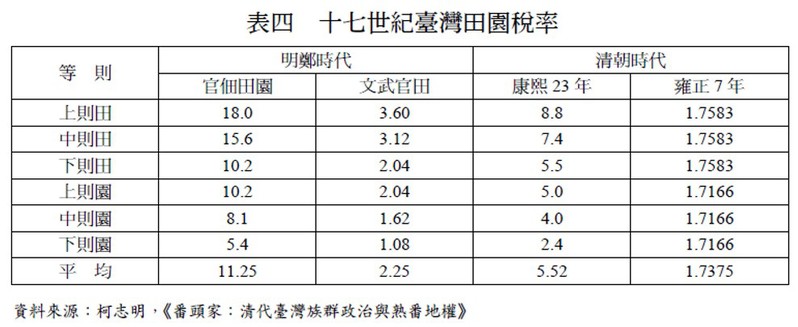 儘管現存史料沒有進一步說明上述「民田」的來歷,但從葉虔要求每甲18石的租額看來,應是屬於明鄭時期的「官佃田園」。因為根據文獻記載,明鄭時期的官佃田園大部分為水田,也只有官佃田園有每甲18 石的稅率(表四)。換言之,這些人原本的身分應該是「官佃」,因為明鄭政權崩潰,佃戶希望爭取田園之主的位置;而施琅則以舊官府之繼承者自居,派遣管事,意欲按舊收租。針對此案,季麒光排除來自施琅的壓力,「將葉虔等責懲,斷給歸民」。明鄭時代的官佃也在清初取得了「田園之主」身分,「官佃田園」也隨之轉為「民田」。