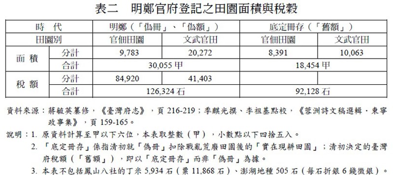 據〈諸羅雜識〉之記載,明鄭官府基本上只管理「官佃田園」與「文武官田」;「營盤田」則為地方駐軍屯墾,在「自耕自給」的名義下,並未為官府所登錄、課稅。上述三類田園中最值得注意的是,明鄭時期由各地駐軍開墾的「營盤田」。尹章義的推想應該沒錯,明鄭降清之際被列入移交清冊──即清初文獻所稱的「偽冊」── 的只有「官佃田園」和「文武官田」,而未包括「營盤田」。結果,清廷各級政府討論臺灣善後事宜時 ──文獻所謂「底定清冊」、「舊額」,也就沒有對「營盤田」進行登記和處分。例如,清初首任諸羅知縣季麒光曾提及,他在清初掌握的田園稅收冊(「舊額」),乃是分由明鄭時期天興、萬年兩州之地方官,以及諸羅縣內各里管事編造的清冊。這兩份清冊的內容只記載:「官佃田園上中下則若干,應徵粟若干;文武官田園上中下則若干,應徵粟若干」。同樣地,清初方志登錄的田土、稅收分類通常也只有「官佃田園」和「文武官田」,並沒有所謂的「營盤田」之數據。這也就是前引〈諸羅雜識〉在描述明鄭時期三種田園分類後,卻只說「官佃田園」和「文武官田」成為「民業」的理由──「及歸命後,官、私田園,悉為民業」。職是之故,清初的「民田」應只包括明鄭時期的「文武官田」以及「官佃田園」,並未包括「營盤田」(表二)。