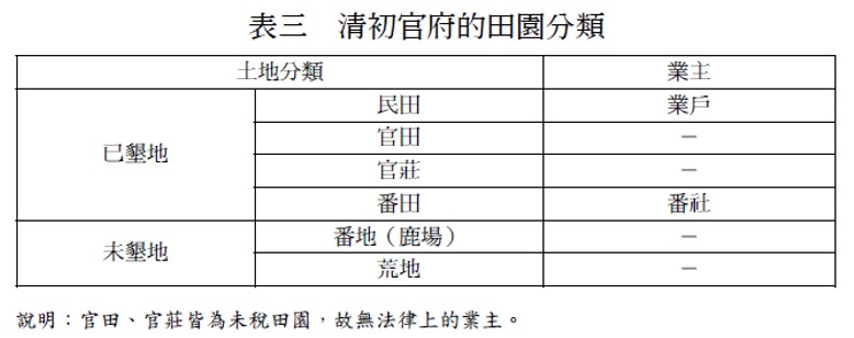 清朝展開臺灣統治之際,地方官員從行政管理——稅收和差徭——的立場出發,將已墾的漢人田園分為「民田」和「官田」兩類(還有稍後隨著民政統治經營而展開的「官莊」)。「民田」基本上是政府課稅和差徭的對象;「官田」則是指已墾卻不在課稅之列的田園,一般也等同於攻臺武官圈佔之田園,實際上比較接近逃稅的私墾田園(表一、表三)。這表示官府帳冊上登記的田園是「民田」。前引〈諸羅雜識〉也曾提及,明鄭時期的「官佃田園」(「官田」)以及「文武官田」(「私田」),在清領之後「悉為民田」。問題是,何以原本的「官佃田園」和「文武官田」,到了清初都變成了「民田」呢?「變成民田」具體上到底是怎樣的一種過程呢?清政府為何不繼續沿用明鄭規制,將之作為國家直屬的「官田」來處理就好了呢?「變成民田」這件事究竟是反映了清帝國和明鄭政權的根本不同,或者只是清初接收的一個意外後果呢?我們不禁對於這個課題感到興趣。
