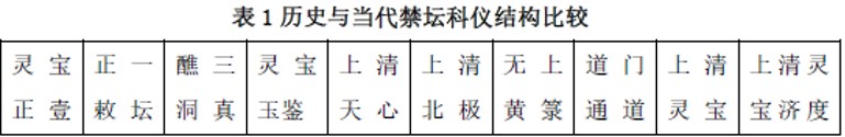 为了比较清楚相关典籍所包含的仪式结构,兹以表1简单说明。借由上述归纳发现,唐代(前)的二本经典所见到的基本仪式结构依序为:存神,召四灵,敕剑水,五方结界,封鬼门。到了宋代的几本仪式类书则开始产生不同的演变。《无上黄箓大斋立成仪》基本上仍延续唐代传统,在仪式结构上没有改变。《道门通教必用集》则在上述基础上增加三个新的仪式结构,而且都属于首见的禁坛相关仪节:人意,解秽净坛,敕醮官。《灵宝玉鉴》的变化比较显著,与基本结构相较:多了变神,九凤破秽,召役发遣,但却少了封鬼门。除了九凤破秽外,变神与召役发遣并不在禁坛的相关仪节中,主要特色是三个仪节都包含丰富的科法。到了明代《上清灵宝济度大成金书》则增加启圣与召官将,但后者不属于禁坛相关仪节。值得注意的是该书的“平常斋坛用”部分,几乎已经涵盖当代台湾北部禁坛的所有仪式结构,除了仅见于《灵宝玉鉴》的召役发遣。