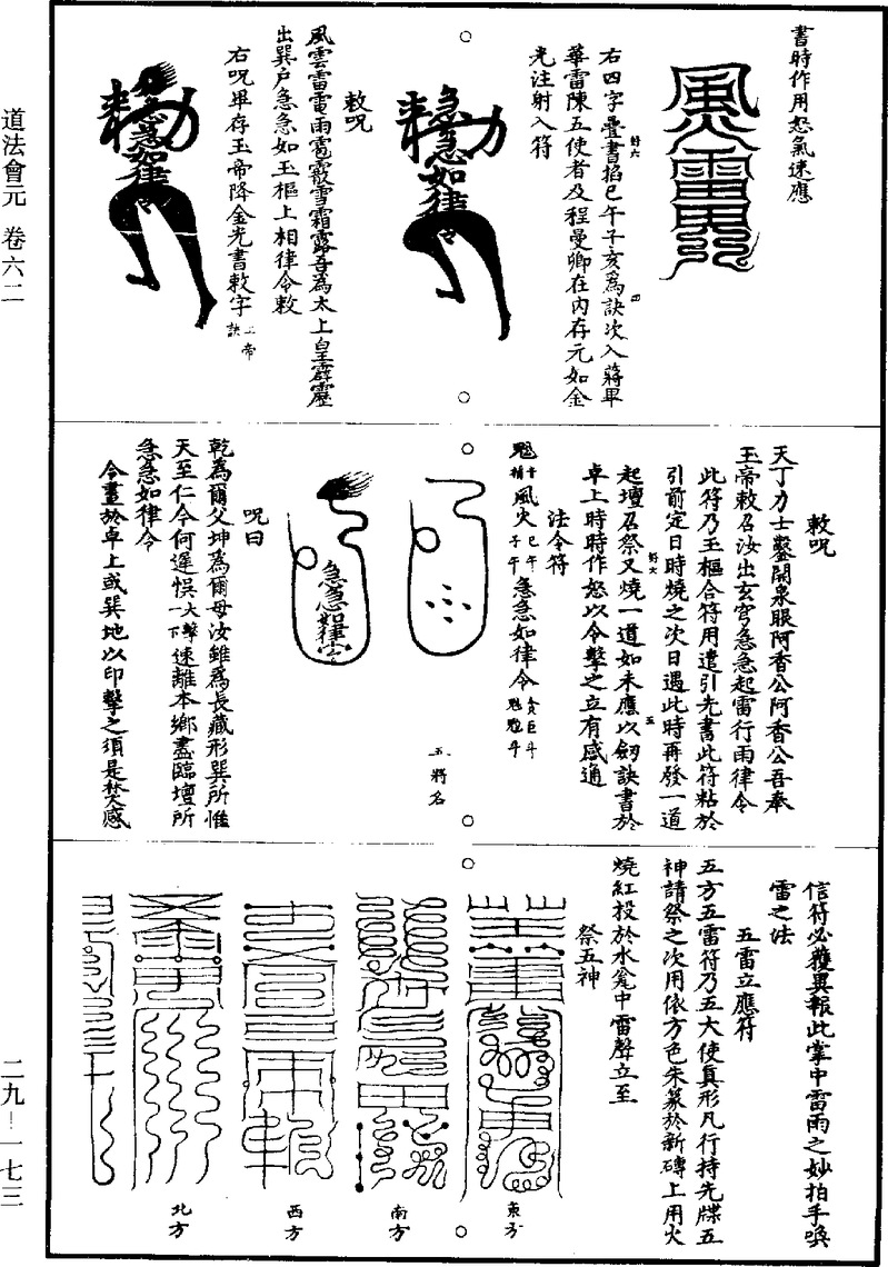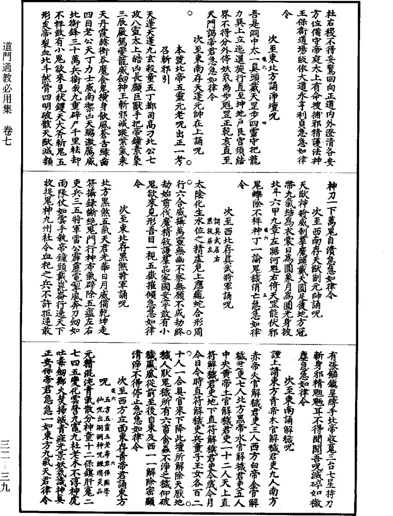 我今结界至于东,分甲乙,应苍龙,岁星乘木德,破秽召青童。云蔼蔼,满长空,旌旗列队伍,光映扶桑宫,蹑罡履斗居震位,寅卯鬼户不相逢,急准东方九炁天君律令。青灵始老天尊。(合 罡图)吾今结界至于南,丙丁火,荧惑间,芒角森龙凤,邪魔心胆寒。霞飞烟骋,虹霓往还,雷门禹步立,杀鬼酆都山,吾今仗剑驾火龙,镇守不离巳午间,急准南方三炁天君律令。丹灵真老天尊。(明 罡图)吾今结界至于西,白虎望,金精威,太白凌清汉,腾霜耀紫微。刀剑如雨,大阐神威,白虎长拥护,杀气贯虹霓,泻倒天河洗兵甲,驻札庚辛不动移,急准西方七炁天君律令。皓灵素老天尊。(天 罡图)吾今结界至于北,玄武位,龟蛇逐,妙哉符五炁,佩受杀鬼箓。杀气腾腾,兵戈整肃,北帝统天兵,副将三十六,竖起玄天皂纛旗,扫荡北方鬼神哭,急准 北方五炁天君律令。玄灵元老天尊。(帝 罡图)吾今结界至于中,喷法水,净四方,高穹符戊己,邪魔入地藏。黄头大将,侍卫我傍,中山有神咒,一诵天地光,凶秽肃清无障碍,亿千兵马护坛场。吾从中央结界至于上方,上方结界至于下方,下方结界至于醮坛之所,十方肃静,无动无作,急准 中央一炁天君律令。黄灵皇老天尊。(日 罡图)
