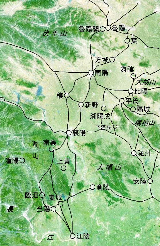 在荆山和大陽山之間,即漢水及其沿岸一帶,既有水路也有陸路,都是連結襄陽和江陵兩地的。關於這些路綫分布,嚴先生前揭書篇28《荆襄驛道與大堤豔曲》曾做過研究,此外,篇29《成都江陵間蜀江水陸道》對江陵和四川間長江流域的水運交通也做過探討。嚴先生探討的時段主要是唐代,但也充分關照到南北朝時期的記述,據此,我們已能够充分瞭解相關情況。