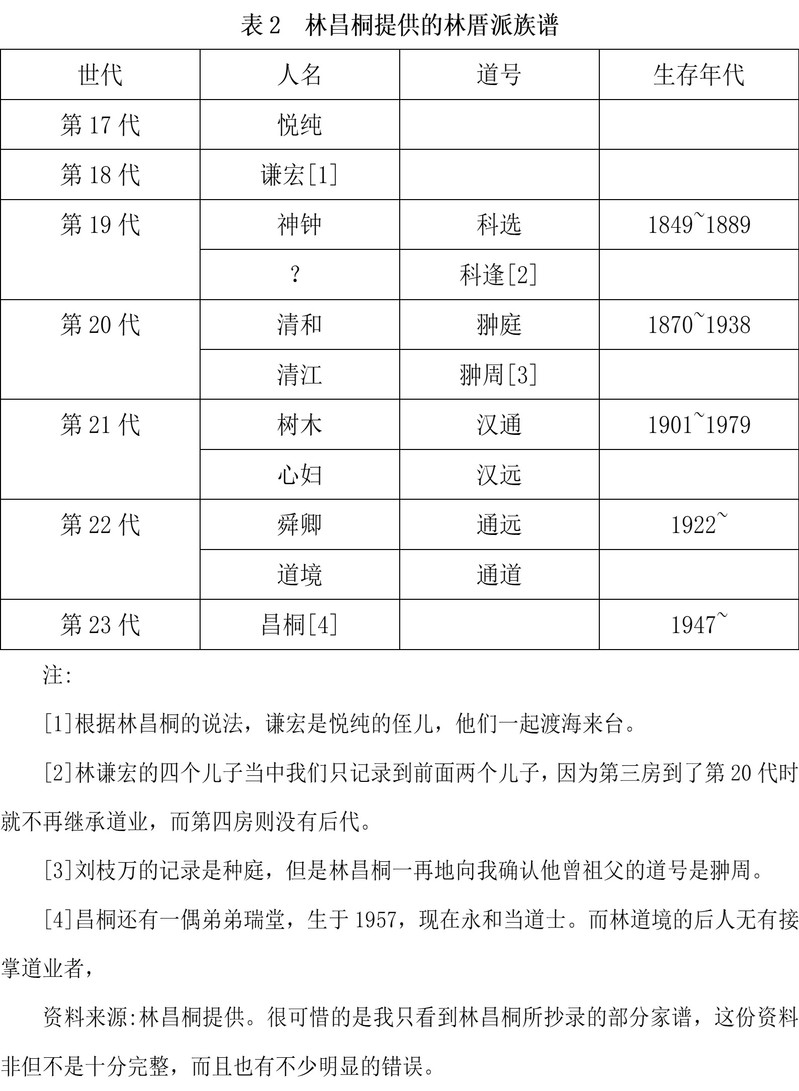 虽然表2兴林厝族谱或是刘枝万所说的不甚相符,但是也不致相差太远。另外从林厝的派诗也可看出他们请神仪式中所召请的祖师道号是:忠、正、演、金、科、翀、汉、通、玄、蕴。