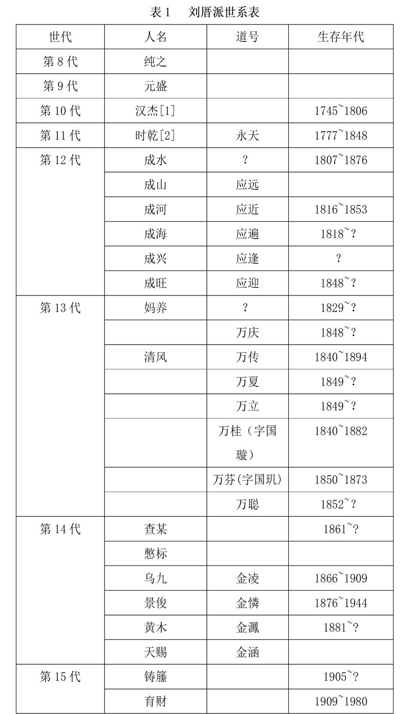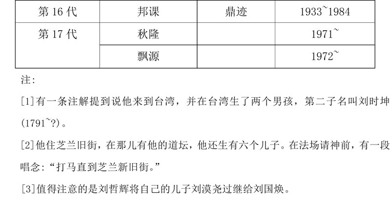 朱堃灿最后又建议我去见刘秋隆,刘秋隆是刘金凌的孙子。朱所以没有一开始就向我提及此人,那是因为刘秋隆现年才18岁,刚开始学习道业,而他的父亲刘邦课逝于1984年,也是很晚才师事刘国焕学做道士。另外还牵涉的是礼貌问题,因为族谱是一种相当私密的文件,不轻易向外人示现。要求刘秋隆给我们看族谱,无疑是项十分冒失的举动。不过我们总算见到了这份族谱,表1就是从这份族谱所抄录下来的。