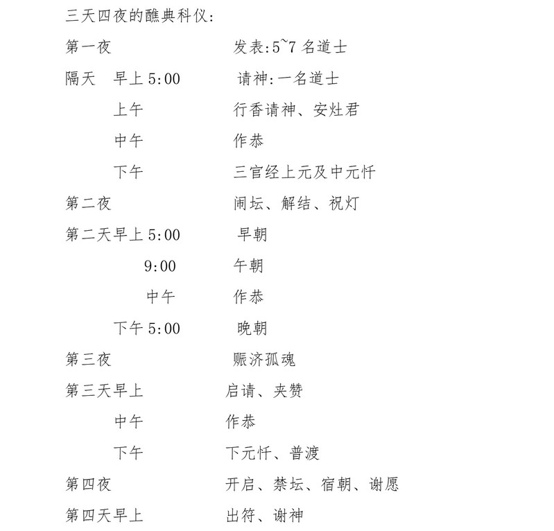 除了两个地方不同之外,这份科仪流程和台湾北部所见的完全相同。第一个不同点是:开启和禁坛在台湾大都放在第二天,即第三夜举行,而不是最后一个夜晚。第二个不同点则或许和前者有关:在南陂,他们有两次和孤魂有关的仪式,我们可以假设在台湾为使最后一夜的工作轻松一点,所以将赈济孤魂这项仪式省略,改成开启和禁坛。