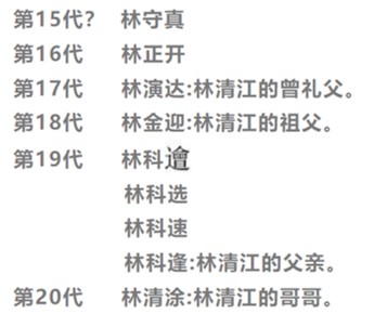 接下来我着手进行对林厝派的调查。首先我去拜访林昌桐,从他提供的族谱中可以整理出表2。