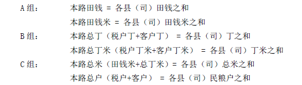 图片上列各组等式存在若干误差,如各县(司)“田钱”、“田钱米”的总和分别为175.278贯、约12427.4石,相比本路田钱、田钱米总额数字分别高33文、低约7石米,但误差率分别只有万分之二、万分之六,完全可以忽略不计。其余各组误差率也很小,这里不再展开(参表2)。