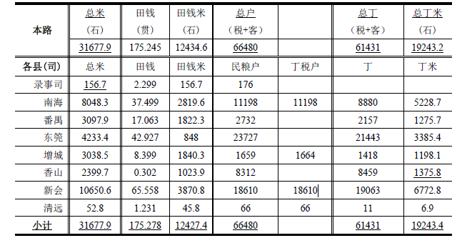 资料来源:《(大德)南海志》卷六。注1:表中加下划线的项目、数字均为笔者增补。其中(1)本路总米 = 本路田钱米 + 本路税户丁米 + 本路客户丁米;(2)本路总户 = 本路税户 + 本路客户,总丁、总丁米类同;(3)香山县丁米 = 本县民粮米 – 田钱米;(4)录事司民粮米 = 本司田钱米;(5)“小计”是各县(司)相应项目汇总。