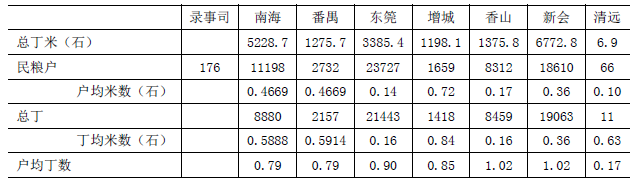 表4特地将南海、番禺两县的“户均米数”、“丁均米数”保留了四位小数,以显示两县数字的高度接近,特别是户均米数完全相同。这种情况绝不可能出于偶然,只能是因为南海、番禺两县的户、丁、丁米数字的背后,有一个整体的、为两县共同采用的税额摊折体系。上文已经指出,南海、番禺的民粮户数、总丁数如果曾经反映了户口登记的实际情况的话,那么这一情况只可能存在于至元二十七年以前,以这些户、丁数字为基础的税额摊折体系也只可能反映至元二十七年以前的情况。至元二十七年抄数以后,南海、番禺两县户口数变化极大,此时即使这两县的确存在着某种按丁征税的政策,它与《南海志》所记载的“丁米”也不是一回事。