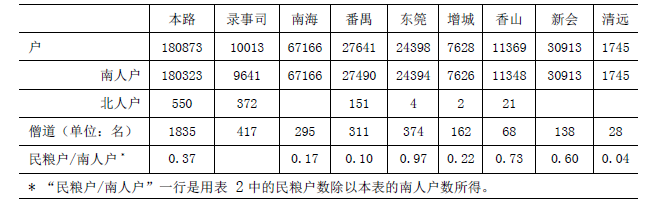 将上举各次籍户数字与前文表 2中的“民粮户”数比较,会发现差异很大,而且各县(司)情况不同。东筦的大德八年报数与“民粮户”几乎相同(参表2),香山、新会两县相对接近,其余五县(司)则相差悬绝。因为大德八年总户数与“至元二十七年抄数”相差不大,因此在元代的官方籍册中,广州路的户口格局应该从至元二十七年以后就基本固定了。那么在表 2中,至少东筦、香山、新会之外的那五县(司)的“民粮户”数字一定是至元二十七年之前的,很可能是自南宋沿用而来。