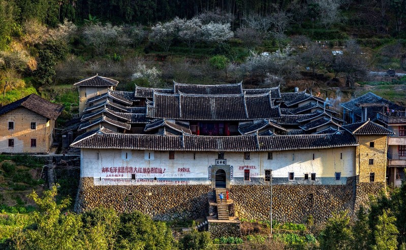 咸丰十(1860)年,锦安黄氏家族第十五代黄孟钢修建的穀贻堂在长万落成,筑在半山,属土木结构,占地面积1727平方米,建筑面积2650平方米,正座七开间,两边双过水,双间护厝,下有书院。(图1)光绪二十一(1895)年,孟钢长子黄学书在隔壁周坑村起造绍安庄,又称周坑寨,依坡而建,平面呈长方形,占地面积3708平方米,建筑面积2790平方米,总面阔44.1米,总进深40.9米,大小房间186间。(图2)此后,三子黄学猷于光绪三十一(1905)年在穀贻堂对面起造积善堂,又称长万新厝,平面呈八角形,总面阔44.5米,总进深41.6米,占地面积1610平方米,建筑面积3117平方米。(图3)当地人将以上三座相继建起的庄寨合称为“父子三庄寨”。