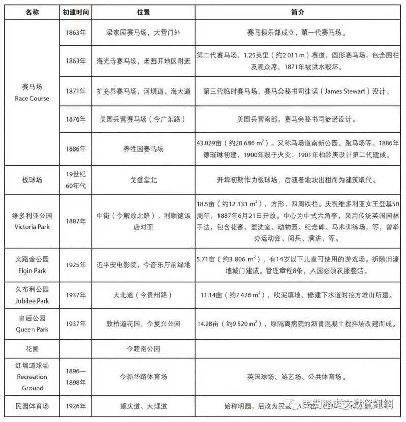 1860年第二次鸦片战争后天津开埠,英、法、美最初在老城南部的海河沿岸划定租界。其中以英租界面积最大、建设时间最早,分别于1897年和1903年两次扩张,并在1902年将美租界合并。由于英国早期的城市规划理念在公共卫生方面有很多考量,在其地理条件迥异的海外领土的规划建设中,确保侨民健康成为了重要考量之一,因而在其租界建设初期,便十分注重公园、体育运动等休闲空间的规划。在1860年至1943年英租界存续的83年期间,天津共有维多利亚公园、义路金公园、久布利公园、皇后公园四座大型公园,赛马场、民园体育场、红墙道球场三处公共体育空间,以及花圃等小型公园(见表1)。