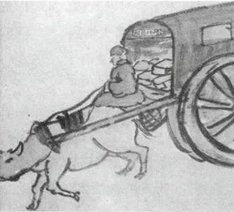 寺庙景观也有日常性,庙内僧道如普通市民一般在城市中生活,既有职业活动,也有七情六欲。他们帮助市民求神拜佛、婚丧嫁娶,穿行于胡同之中,市民早将他们看作日常生活中的一员,而非离群索居的奇僧高道。清末陈世曾所绘风俗图画,因篇幅不多,虽未详细介绍,但其中也出现了这类日常生活中的僧道形象,如其下这幅《陆地慈航》,画上为一僧人,赶车穿行于街巷中,搜集被遗弃的婴孩掩埋。这位僧人虽然行的是佛教善事,但穿着行为均与常人无异,能看出作者对他的认同感。