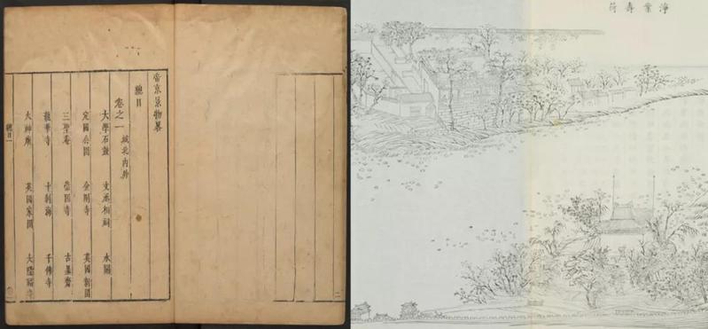 《帝京景物略》由刘侗、于奕正同撰,记述明北京地区的山川园林、庵庙寺观、桥台泉潭、岁时风俗,崇祯八年(1635年)冬初版刊行。《鸿雪因缘图记》是纪游图的代表之一,即中国文人为志游而作、表现旅途中的见闻与观感的“漫游图记”。左图为《帝京景物略》明崇祯本总目书影。[图源:gmzm.org]右图为《鸿雪因缘图记》中的《净业寿荷》。[图源:bjcs.cnu.edu.cn]