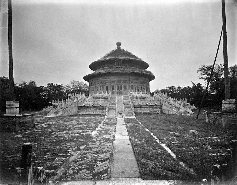 大光明殿是明朝和清朝的皇家祭坛,为道教宫观。它是整个建筑群中的主体建筑,形制犹如缩小的天坛祈年殿。后被八国联军烧毁,现不存。图为1879年左右的大光明殿。[图源:Wikipedia]