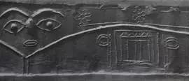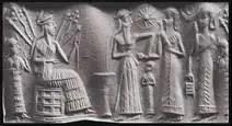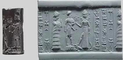 在两河流域神话中,苏珊花是与金星女神伊南娜(苏美尔语Inanna,阿卡德语称“伊什塔尔”Ishtar)紧密联系在一起的。埃及蓝白两种睡莲皆具有兴奋人的中枢神经的作用,蓝睡莲的药用效果更强,具有催情作用。在两河流域神话中,金星女神司爱情之职,其图像标志是苏珊花(正平面莲花),见图21。图22是一枚苏美尔时期的滚筒印章上的图案,上面也有金星女神伊南娜的标志太阳状的正平面莲花。图23是苏美尔滚筒印章上手持苏珊花的伊南娜。