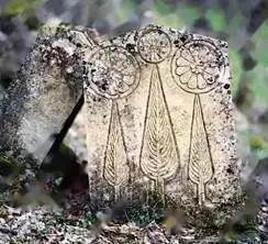 犹太教产生于基督教之前,深受埃及和波斯文化的影响。莲花的象征寓意和圣花情结也深深扎根于犹太文化中。犹太教徒的墓碑图案比较多见莲花、烛台和大卫六芒星。图40犹太墓碑上是一只手拿着侧面莲花座的圣水壶,而图41犹太墓碑上则是一朵造型独特的正平面莲花。图42是犹太教卡拉派(Karaism)教徒的墓碑,该教派是犹太教中的少数派,在大流散时期一直生活在中东地区,受波斯文化的影响较深。该犹太墓碑上是一朵典型的波斯正平面莲花和典型的波斯柏树图案。