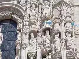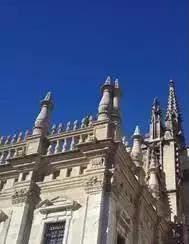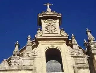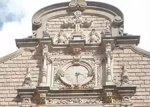 莲花座托圣物也并非是只有佛教才有的特征。在天主教建筑装饰中,莲花座上供圣徒、宝塔(宝瓶-净水)、圣火(焚烧人间罪恶之火)非常普遍。图48为西班牙科尔多瓦大教堂。原为清真寺,建于8世纪。西班牙占领科尔多瓦后,于1236年改为天主教大教堂。其大门上方两侧共四个莲花座托净水宝瓶。图49为西班牙塞维利亚大教堂,建于15世纪初,也是在原伊斯兰教清真寺的旧址上改建而成,莲花柱头之上是净水宝瓶,瓶中升腾出火焰,宝瓶底座是莲花座。图50是西班牙蒙特塞拉特修道院,建于14世纪;大钟两侧是莲花柱,柱两侧是莲花座托宝塔,大钟上方十字架下端两侧也是莲花座托圣物。