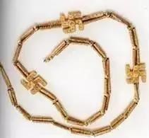 基督教标志符号“十字架”的形成也与埃及-西亚这个大环境的宗教文化密切相关。十字架的来源之一,应当是源自印度-伊朗雅利安人的圣神符号“卐”或“卍”字符,象征了太阳光芒的旋转。这一点基本已经是学界共识。这类符号在伊朗境内发现很多,这里仅举具有代表性的两例。图30是卐字符纯金项链,发现于伊朗吉朗省马尔利克山丘,至少属于公元前1000年,现藏于伊朗国家博物馆。
