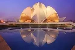 莲花作为象征灵魂获拯救之花,还普遍用于各种宗教建筑上。伊斯兰教清真寺采用了各种莲花造型,这在世界各地的清真寺中都有表现,如图46是伊朗伊斯法罕谢赫清真寺层层叠叠的莲花瓣门券洞造型;产生于伊朗的、当前发展迅速的新兴宗教巴哈伊教在印度新德里的莲花寺(图47),世界著名。