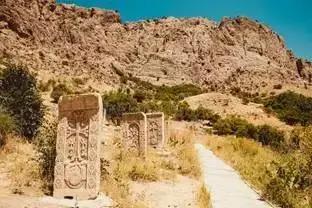 图44是亚美尼亚诺那万克(Noravank )修道院后山上的墓碑。该修道院建于1205年。其碑上的十字莲花造型与图34大致相似,但雕刻更加精美繁复,底座为正平面莲花,墓碑边框也是雕刻精美的正平面莲花环绕。