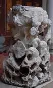 我们再看看伊比利亚半岛上的天主教建筑。图12是葡萄牙里斯本的热罗尼莫斯修道院(Jerónimos Monastery,修建于1502-1580年)的大门周边群雕,其中有在莲花座上供奉圆形宝塔的造型。我们再看看中欧地区犹太教中莲花图案的情况。图13是乌克兰罗哈廷(Rohatyn)市的一座犹太老公墓中的一块墓碑。墓碑上端两侧皆装饰以莲花图案。图14ab是波兰卡齐米日多尔尼(Kazimierz Dolny)市的老犹太墓区的一块古老犹太墓碑,整个碑上部边缘,或装饰以莲花瓣图案,或装饰以盛开状的侧面莲花图案。