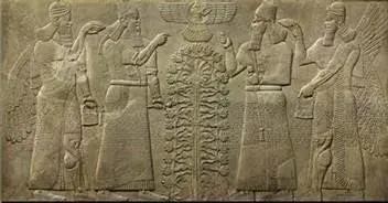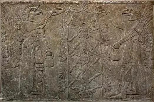亚述帝国称霸西亚时期,对苏珊花(莲花)更是顶礼膜拜,将之视为圣花。亚述时期的图像资料充分证明了这一点。图24是出自亚述都城尼姆鲁德的浮雕,大约属于公元前9世纪,表现的是神鹰在用圣水给苏珊花(莲花)行洗礼。图像中央是柱子一般的花径;花径从底座到上端有三层莲花座,柱子顶端盛开莲花;柱子四周是莲花与茎蔓交织,笼罩整个莲花柱;两只神鹰用圣果蘸提桶里的圣水为莲花行洗礼。图25浮雕也是出自尼姆鲁德,表现的是亚述国王阿淑尔·那西尔帕二世(Ashur-Nasirpal II,883-859年在位)面对莲花圣树的宣誓仪式,天使在其身后用圣果和圣水为之行洗礼。