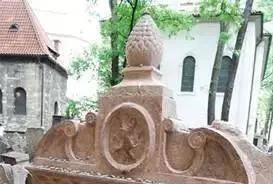 至于这圣果是什么,笔者倾向于认为是莲花蕾。笔者在多种犹太教徒墓碑图像中看到这种莲花蕾状的圣果,这里仅展示一例。图26ab是16世纪布拉格著名拉比犹大·勒夫·本·比撒列(Udah Loew Ben Bezalel,1512/1526之间—1609年)的陵墓墓碑,位于布拉格古老的犹太人墓地。该墓碑顶部即是一枚圣果,墓碑下端三根柱子上盛开莲花。
