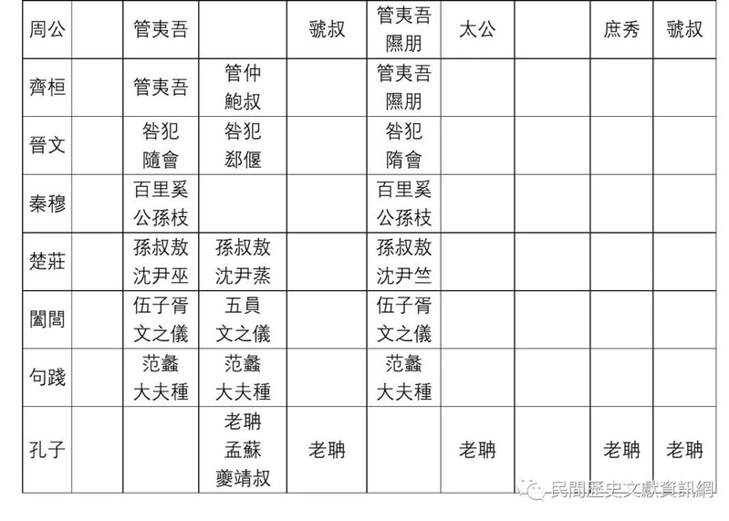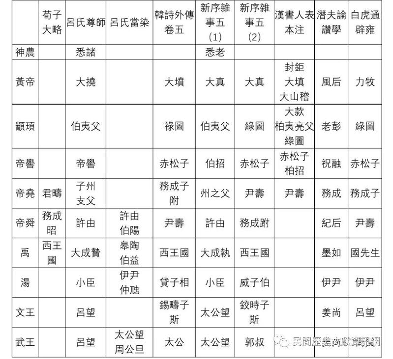 上表從齊桓公至句踐是《呂氏春秋》所謂的六賢,與本文無涉,暫不多論。其餘古聖所師,各書所記不盡相同。除因傳聞異辭、傳刻訛誤者,大致可見有三個系統:(一)《呂氏春秋•尊師》與《新序•雜事五》(1)僅文字小異,《新序》明言引「呂子曰」,屬同一系統;(二)《韓詩外傳》、《新序•雜事五》(2)、《白虎通•辟雍》所記接近,屬同一系統;(三)《潛夫論•讚學》提到風后、老彭、祝融、紀后、墨如、庶秀等為古聖師,與他書差異甚大,應另有來源,自成一系統。《新序•雜事五》兼載異說,而《漢書•古今人表》本注也是諸說並存。《新序•雜事五》(2)說則是大體淵源自《荀子•大略》。先秦古籍存者寡,佚者眾。當時傳說紛紜,必有多於今日所知者。例如《呂氏春秋•當染》除了說孔子「染」於老聃,還染於孟蘇、夔靖叔。後二者全不見於先秦它書,也不見漢世文獻再提及,其事遂佚。《史記•仲尼弟子列傳》謂:「孔子之所嚴事:於周則老子;於衛,蘧伯玉;於齊,晏平仲;於楚,老萊子;於鄭,子產;於魯,孟公綽。」《史記》所本即不同於《呂氏春秋》。紛紜的眾說中,唯孔子師老聃或老子一事,各家記載一致。這個說法不但道家之徒,儒生自荀子以後也幾乎無不接受。這是漢世孔子見老子畫像出現的基本背景。上表古聖所師的對象,有一個有趣的共同點,即這些古聖都是儒家心目中的古聖人,但是他們所師的人物,除了一些今天已不知其事蹟的,幾乎全是道家、陰陽家或神仙家中的人物。黃帝所師的力牧、大(太)山稽見《列子•黃帝》、《淮南子•覽冥》。《列子•黃帝》言黃帝召天老、力牧、太山稽,告以「養身治物之道」。《淮南子•覽冥》謂黃帝治天下,力牧、太山稽輔之。馬王堆漢墓出土老子乙本卷前古佚書《十六經》部分,即有黃帝與「力黑」(按即力牧)、「大山之稽」論道之言。其思想在道、法之間。敦煌漢簡中也發現力墨與黃帝問答殘文,羅振玉以為即兵家《力牧》篇。《漢書•藝文志》兵陰陽有《力牧》十五篇,《風后》十三篇。又道家有《力牧》二十二篇。顓頊所師的老彭,疑即彭祖。馬驌曰:「即彭祖,陸終子也。」梁玉繩謂:「老彭疑彭祖之裔,舊以為即彭祖。恐非。」《世本》謂彭祖壽八百歲。《莊子•刻意》謂吐故納新,熊經鳥申,「此道引之士,養形之人,彭祖壽考者之所好也」。彭祖為古傳及道家養生一派樂道的傳奇人物。1984年江陵張家山出土簡《引書》言導引養生之術,開宗第一句即說「此彭祖之道也」,馬王堆帛書〈十問〉也有王子巧父問彭祖養生之事,即為明證。