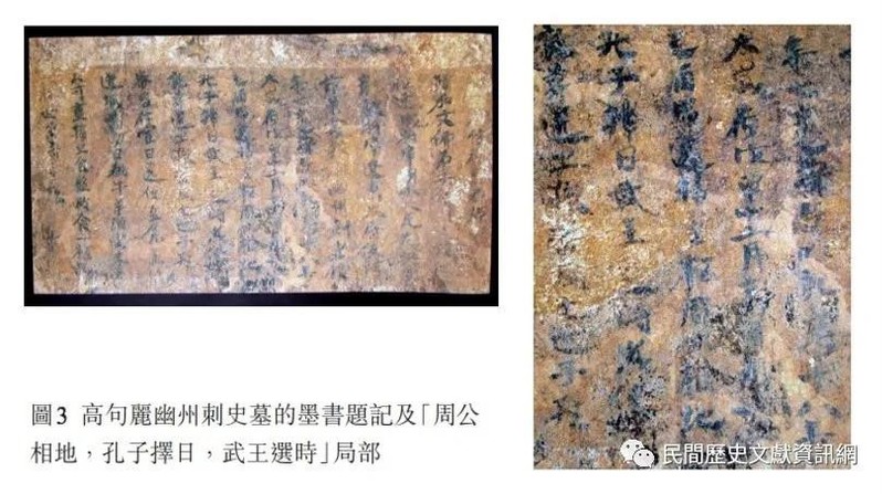 除了以上流傳不絕的文獻,漢墓的壁畫、畫像石和畫像磚上也出現很多以孔子見老子、項橐,甚至周公、晏子或左丘明為題材的畫像。在屬於東晉時期,位於今朝鮮平安南道大安市德興里的高句麗幽州刺史墓的墓室裡,則曾出現「周公相地,孔子擇日,武王選時」這樣的墨書題記(圖3)。過去我們對孔子的印像主要來自儒家經典、經學家的章句、傳記和注疏。除了前文提到的民間文學和祠廟,這些圖像和墓葬裡的材料呈現出一位和儒經裡頗不一樣的孔子,可以幫助我們從不同的角度去認識孔子的形像和變化。