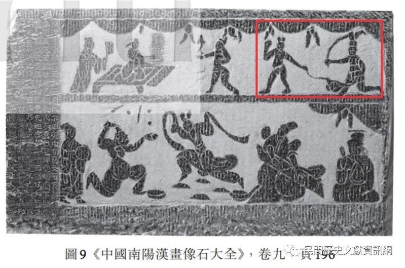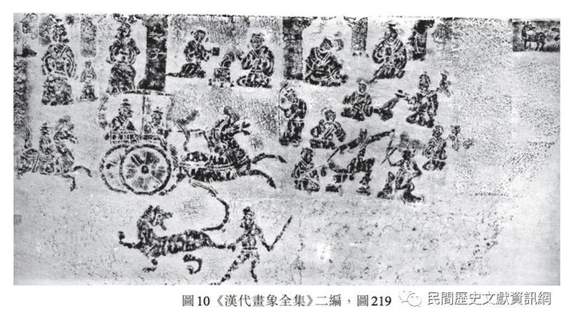 第三,本文雖嘗試疏解漢代孔子見老子圖的多重意義,事實上仍有不少矛盾和未解之謎,有待進一步思考。較明顯的例如:如果我們以為漢人所熟知的孔子見老子與項橐的故事,具有孔子不如老子或項橐而對孔子加以嘲笑的意味,這樣的圖像反絕大多數出現在以孔子為榮的齊魯不是很奇怪嗎?又如果我們以為老子在漢末是被當作神仙,或超乎神仙的人物看待,為甚麼在畫像上的老子形像和孔子相類,都戴進賢冠,衣儒生之服,而不像漢人想像中身形削瘦,長耳又四肢帶羽的仙人或羽人?如果東漢畫像依據的圖譜源自劉向,而列老子於《列仙傳》者又可能是劉向,難道《列仙傳》中的老子在形貌上和常人無異?隨著兩漢老子形象的日趨神仙化,為何其外形不見隨之變化?從和林格爾墓壁畫的整體內容看,孔子見老子的部分是和其他孝子、孝女故事圖置於同一壁面空間,僅以淡淡不完整的橫線隔開。這部分壁畫的目的怎能說成是在歌頌老子或取笑孔子,而不是總體表現對儒家道德典範人物的服膺?類似的佈局也見於《漢代畫象全集》二編圖219的山東臨沂畫像(圖10)。畫中左上端有清晰的老子、孔子及榜題、居中矮小的項橐,其右有雙人對坐飲酒以及最少四位手持鳩杖的老者在觀賞他們前方的百戲。百戲場面的左前方則有一輛朝右駛來的馬車和從騎。最前方則見一人持刀搏虎。在這樣的佈局中,老子、孔子、項橐都好像是居於邊緣的佈景或道具,畫面述說的重點明顯不在於歌頌老子或取笑孔子。對以上這些問題,這篇小文其實都無法完滿回答。