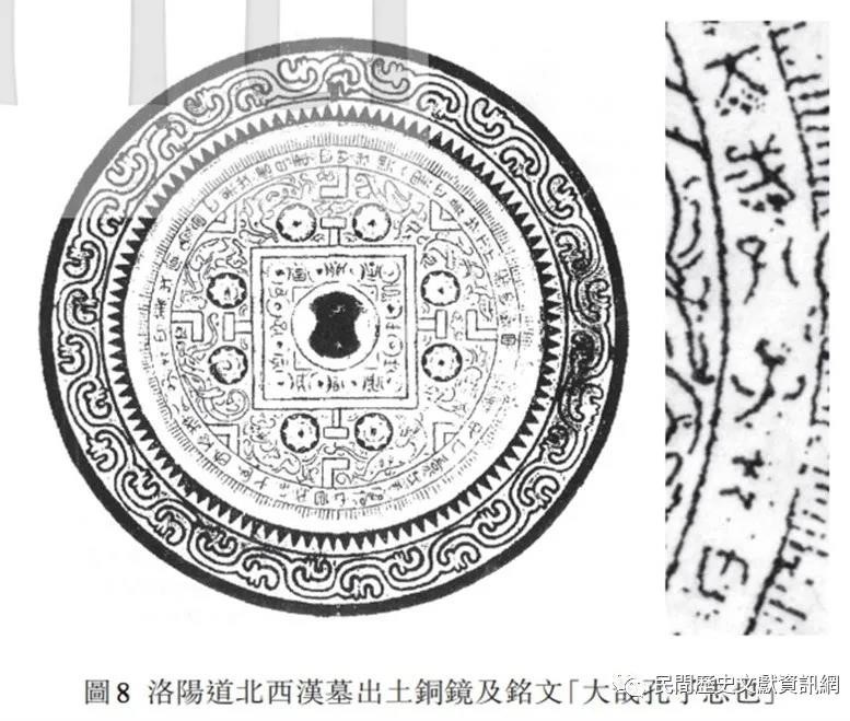 對這一個問題,晏子或許尚可解釋,周公卻很不好理解。至今我還沒有好的答案。僅能說這或許說明了在某些漢儒心目中孔子的地位次於周公,但在另一些人的心目中孔子已超越周公。1983年洛陽道北石油化工廠家屬院發掘的一座西漢晚期墓中,出土一件十分完好的帶銘博局紋銅鏡,鏡上銘文有「大哉,孔子志也」的句子(圖8)。「志」字拓本不十分清晰,姑從原釋。值得注意的是銘文單獨提到孔子,沒有周公;其次在孔子前加「大哉」二字。我們知道孔子曾以大哉形容堯之為君(《論語•泰伯》、《孟子•滕文公上》),達巷黨人也以大哉形容孔子(《論語•子罕》),鏡銘用字多少可反映孔子在不同漢人心目中的特有地位。從後世的發展看,孔子的確是逐步超越周公,達於獨尊無二。