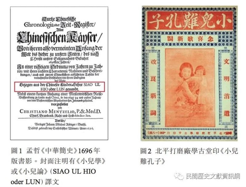 自從宋代的童蒙讀本《三字經》將「昔仲尼,師項橐」一事納入,造成更為普遍的流傳。這個故事據王重民等先生研究,後來又見於明本《歷朝故事統宗》卷九〈小兒論〉和明本《東園雜字》。日本學者金文京更進一步指出自十一、二世紀以後,日本、韓國和越南的民間文學中都有傳本。歐洲方面,德國漢學家孟哲(Christian Mentzel,1622–1701)在他的《中華簡史》一書中將〈小兒論〉譯成德文(圖1)。民國時期,北京打磨廠的寶文堂和學古堂等書舖還在印行販售各種《小兒難孔子》或《新編小兒難孔子》(圖2)。更有趣的是項託在唐代或最遲在明代曾變成了小兒之神,甚至有專門供奉的祠廟。