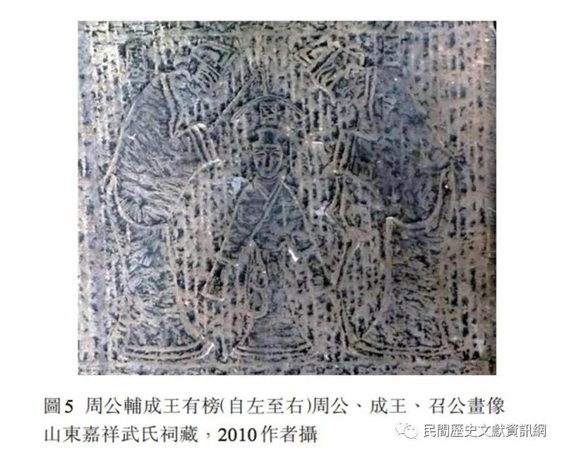 回到畫像本身,還有以下幾點須要一提。第一,不論墓室或祠堂,可供製作畫像的牆、樑、柱,在空間上都是有限的。畫像題材必然經過考慮和選擇。巫鴻先生曾正確地指出,要了解選擇畫像背後的思想,須從墓室或祠堂所有畫像的整體去觀察。他研究武梁祠畫像,發現畫像是由石室頂的符瑞、山牆頂的神仙世界和四壁的人間故事,表現出漢人所認知的一個宇宙整體。各部分的畫像並不是相互獨立,而是彼此關聯的。孔子見老子圖雖有它本身的意義,不過也必須和墓室或祠堂其他的畫像連繫起來,才能更正確地掌握它在整體畫像中的作用。舉例來說,常和孔子見老子畫像相伴出現的就是周公輔成王圖。周公輔成王圖有明確的格套,它也和孔子見老子圖一樣,是漢代畫像中幾乎唯一一個有關周公的題材。這個題材有時單獨出現,有時與孔子圖同見於一墓或一祠堂。它們共同反映了漢儒對周、孔的尊崇。尤其重要的是周公輔成王畫像,以個人所知,目前可考的絕大多數見於山東和徐州一帶。如果將兩圖合而觀之,更可以證明周、孔二人和齊魯舊國的地域性關係。當然隨著儒學成為仕宦的鑰匙,儒生成為官員的主體,官方圖譜的流傳,相關畫像也多多少少在其他地方有了蹤影。蜀郡文翁石室可能很早就有了後人記述中的周公禮殿,但殿中圖畫是何模樣?後人的相關傳述有幾分可信?如今都已難以評估。