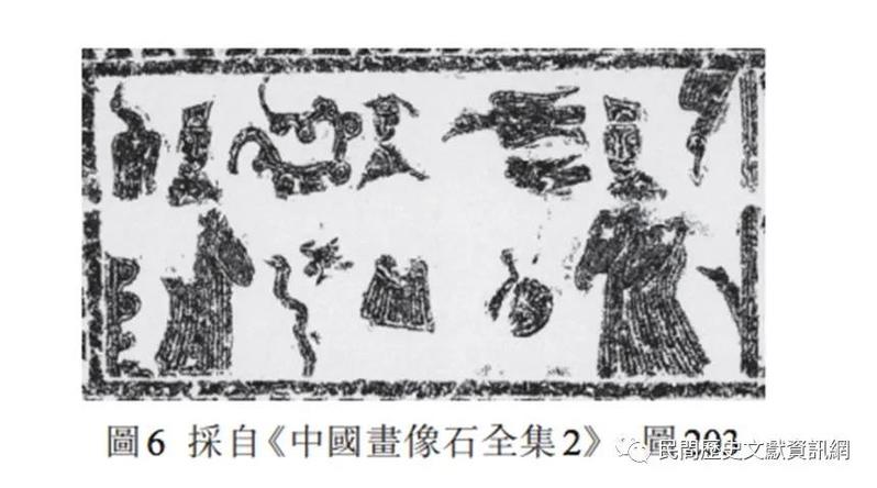 更有甚者,不少人相信孔子及弟子早已成了神仙。孔子被神仙化並不出奇。1981年兗州農業技術學校出土的西漢中晚期石槨上,孔子和老子分別出現在不相連的左右畫框中,畫面結構頗為類似。他們身旁各有鳥,有似龍似虎或無以名之的異獸和嬝繞的雲氣紋(這樣有雲氣紋的孔子、老子畫像也見於前引陝西靖邊漢墓壁畫、河南博物院藏畫像磚,以及山東滕州市官橋鎮車站村出土的東漢石槨(圖6))。熟悉漢代裝飾藝術的人都知道,飛鳥、珍禽異獸和雲氣是漢人用以描繪或襯托祥瑞、天上、非現實世界或神仙世界不可少的元件。被這些襯托著的老子無疑已被視為神仙中人,而有類似襯托的孔子,恐怕也不再是凡夫俗胎了。