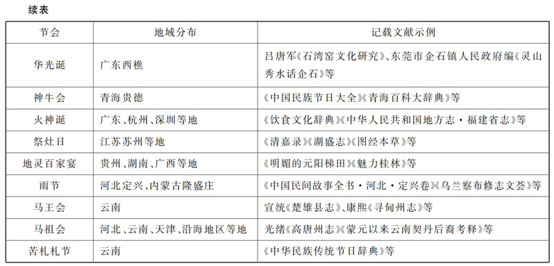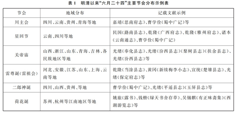 明清时期区域间的人口流动较之前显著增加,各地文化交流频繁,跨地域、跨民族的文化传播愈发兴盛。据文献所载,此时川主会与星回节仍以“六月二十四”为时间节点并广泛分布于西南地区。如《思南府志》载:“俗以六月二十四日、七月二十二日为川主生辰。”如《峒溪纤志》载:“六月二十四日名火把节,苗相聚啖牛豕。”除川主、星回二节外,全国其它地方也多有以“六月二十四”为节庆时间的现象存在(见表1)。