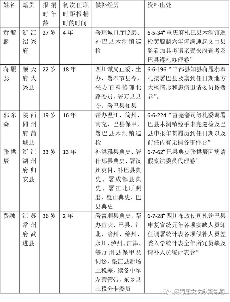 第四,这些报捐者在获得候补官员资格之后,为了增加获差的机率,往往还会不断地多次捐纳。如前文谈到的黄兴遽。表中的巴县木洞镇巡检黄毓麟同样如是。咸丰年间,“由监生遵筹饷例报捐巡检,指发四川”,后又“嗣遵新例捐足四成,请以新班遇缺即补”。