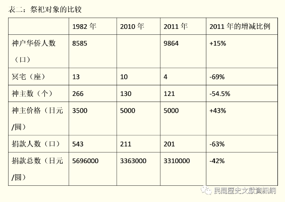 从表二可以知道,虽然神户华侨的人数增加了,但与有显著降幅的冥宅、神主和捐款人数和捐款总数比较,这个增幅显然并不显著。同时,这样的发展也许和该仪式活动的跨族群性质的减弱以及华侨入籍、逐渐采取日式的丧葬和悼念方法并且疏离和神户的地域关系有关。