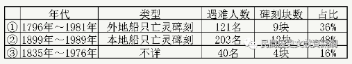 将25块碑刻进行年代与数量上的整理,可以得出以下结论(表2)。外地船只的亡灵碑刻为9块,占比为36%。此类碑刻上一般只记载了遇难人数,没有亡灵们的名字。其年代主要集中宽政8年到昭和56年(1796年至1981年)之间。外地船只亡灵碑刻出现较早,很大部分原因是他们被安葬在这里,船难碑刻其实也是他们的墓地和墓碑。大正(1912 年)以后,外地船只亡灵碑刻突然大幅减少,其原因应该是多方面的。比如:明治时代以后,由于船业发展迅速,船只体积大型化,其抗对暴风雨的能力大大增强,将船驶入周边村落港湾避风、避难的情况有所减少。战后(1945年以后)附近海域主要作为当地村民的珍珠养殖基地,建成了特定的养殖港口,外地船只一般不太靠近他们的海域。