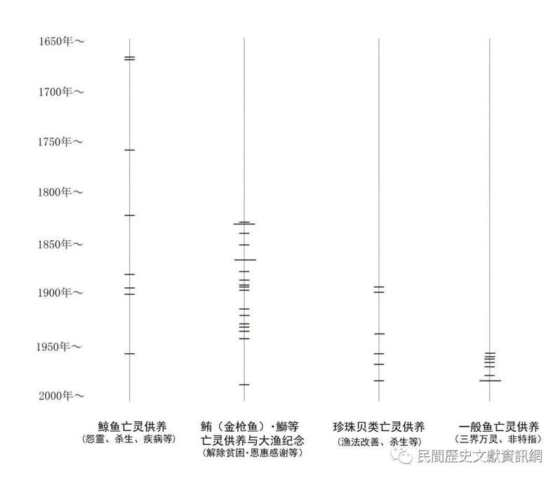 因为篇幅的原因,其他的鲔・鰤鱼等大渔纪念、珍珠贝类供养、一般鱼亡灵供养不能一一展开论述,只能根据图表进行简略的比较讨论。从图表3来看,可以得出以下结论。