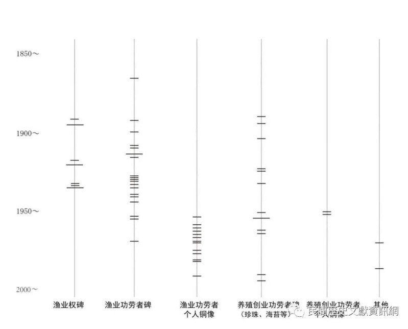 因为篇幅问题,不能如同前文中的各类碑刻一样进行较为细致的讨论。综合图表4,可以考察出村落功劳者在碑刻记录中的变迁。在1950后没有再立渔业权纪念碑。这说明围绕渔场、海域的渔业权纷争基本得到了解决,海域争夺已不再重要。反之,渔业权功劳者在碑文的描述中更多以善于斡旋、英勇神武的作为村落的利益守护者出现,有被“神化”的倾向。从渔业功劳者碑刻和养殖创业(珍珠、海苔等)功劳者碑刻来看,他们是作为村落利益开发者发展现代渔业与养殖业技术。早期的文字碑刻居多,而近年出现大量个人铜像可以看出,从早期被文字“神化”的功劳者变成以铜像图化的“具体人像”的功劳者。他们更多是以科学技术研究的精英知识分子的形象出现,反映了当代大规模发展养殖渔业生产的实际需求。