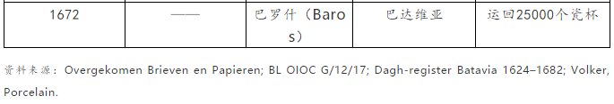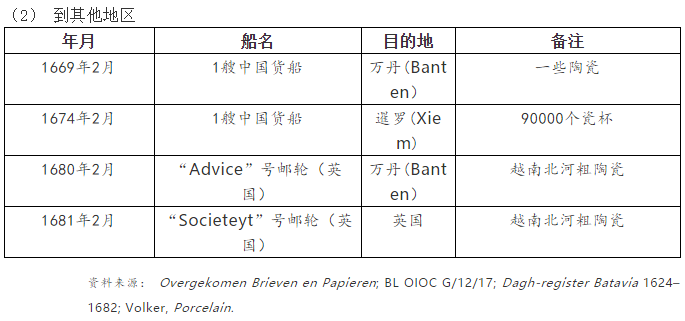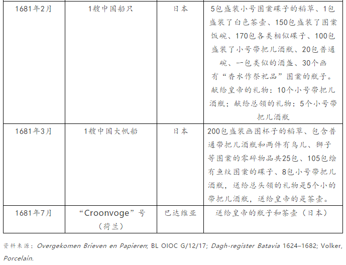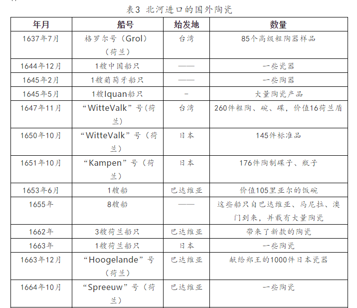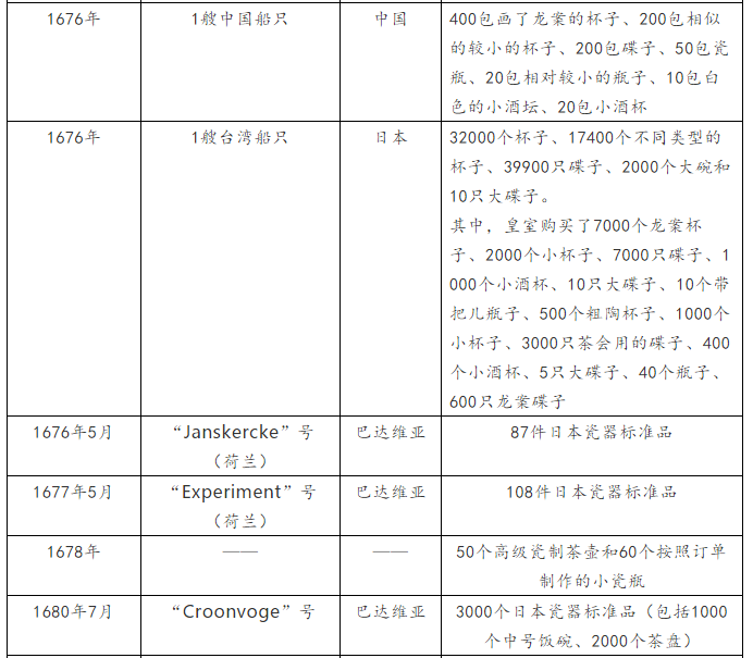 外国商人除了往北河市场采购陶瓷产品外,还运销外国陶瓷至越南北部。表3显示的主要是从中国、日本运销到北河的陶瓷产品情况,同时反映出荷兰东印度公司对这一情况漠不关心的态度,因为荷兰人对北河的进口贸易只重视金属货币(主要是银和铜)的交易,以及皇帝和官员要求携带的一些商品,陶瓷一类的商品不受荷兰东印度公司关注。大部分荷兰人运送陶瓷产品至北河地区都与皇室的订单有关。与荷兰人相反的是,华商对在北河运销陶瓷产品较为主动。仅1676年,华商运到北河的陶瓷标准品(很可能是中国产品)就有9000件,其中包括各类杯盏、碟、瓶、罐、酒杯等,进口到越南北方的各类日本陶瓷标准品约达10万件。