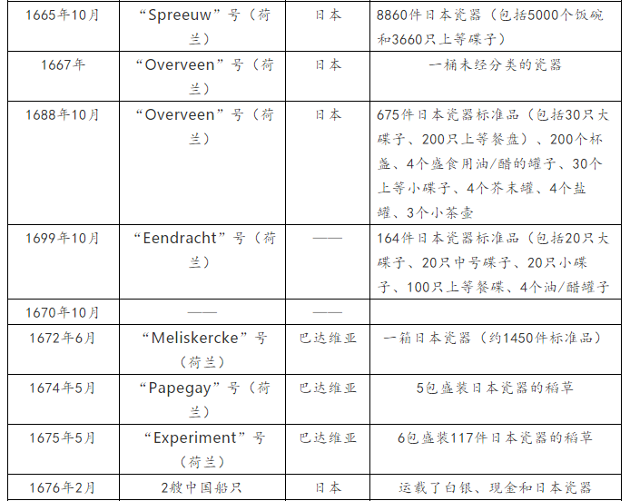 为了替代中国高质量瓷器商品供应源,荷兰东印度公司转而收购日本的肥前(Hizen)瓷器。1650-1651年,荷兰东印度公司在日本出岛(Deshima)的交易站向公司在越南北河的交易站依次寄送了145个风格各异的肥前碟盘和176个肥前瓷板。1652年,出岛交易站将日本的陶瓷商品转贩到台湾的热兰遮城(Zeelandia),自此荷兰东印度公司经常出口肥前瓷器至巴达维亚(Batavia),成为荷兰人销售日本上乘陶瓷的一个里程碑。1657年,荷兰东印度公司转运了一定数量的肥前陶瓷回荷兰销售,并取得了可观的利润。 这一贸易相对稳定地持续了十年。由于进口日本陶瓷运回欧洲的成本过高,荷兰东印度公司与日本的陶瓷贸易渐渐衰落,至1665年基本中断。