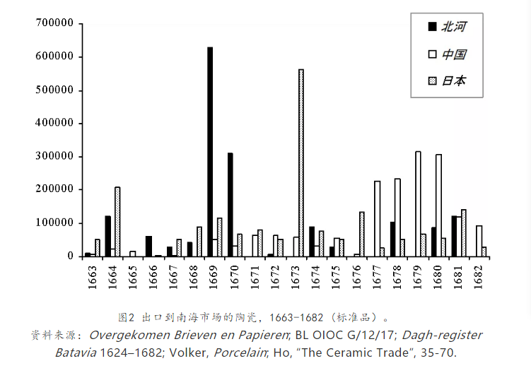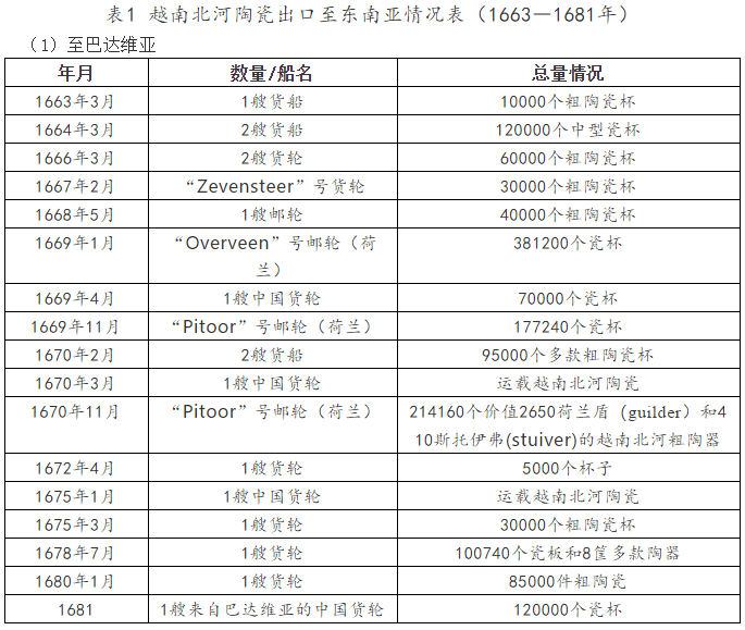 17世纪60年代以前,越南北河的粗陶瓷偶尔会出口到区域市场上,但是每年的贸易总额并不显著。1662年这一事件导致区域陶瓷市场产生巨大变化。1663年,巴达维亚的荷兰人发现中国商船带来了10000个越南北河生产的粗陶瓷。 在随后五年里,大约有250000个越南北河的粗陶瓷被华商转运至巴达维亚(见表1)。至此,中国的上等瓷器在欧洲市场上被肥前瓷器替代,在东南亚市场上被越南北河粗陶器所替代。从此,越南北河的粗陶瓷得以相对广泛的出口到区域市场,并一直持续至17世纪80年代初。由华商大规模运到爪哇的越南北河粗陶瓷给当地留下了深刻的印象,同时也促使巴达维亚的荷兰东印度公司总督和理事会参与到这一贸易网络中来。1669年,越南北河大都会(Kẻ Chợ)的交易站大批收购越南北河粗陶瓷,并运回巴达维亚,总数达381200个。自1669年至17世纪80年代初,荷兰成为越南北河陶瓷的出口国家之一。