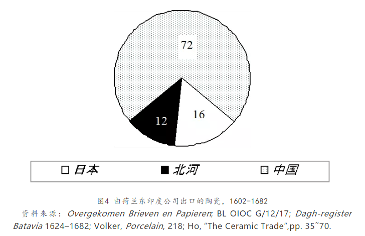 根据一些荷兰资料记载,17世纪60-80年代期间,大约有150万件越南北河陶瓷标准品出口至东南亚市场。因为统计资料不完整以及我们尚未能够完全挖掘现有资料等原因,实际出口的数量肯定更多。忽略上述情况,依据荷兰东印度公司档案资料提供的数据,仅在1663-1681年间,越南北河陶瓷数量占出口南海市场(自日本延伸至非洲东海岸)份额的30%,而其余陶瓷产品的份额分别是日本:33%,中国36%和中东、近东接近1%(图3)。如果我们认可握克(volker)的“保守估算”,即在1602-1682年间,荷兰东印度公司已进口了约1200万个亚洲陶瓷标准品,那么,越南北河陶瓷占比约12%(仅仅在20年间),日本陶瓷占比约16%,中国陶瓷占比约72%(图4)。